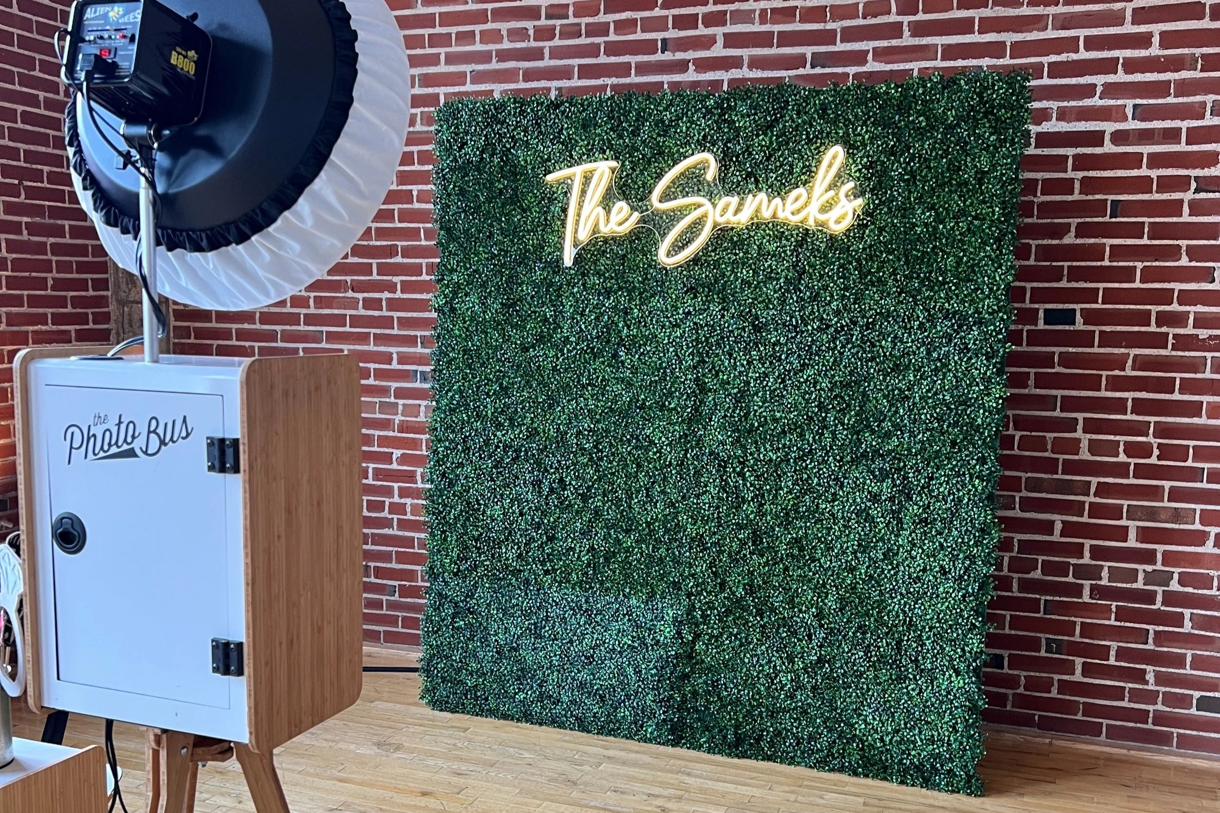 This greenery wall is commonly used as a backdrop with The Open Air Booth and The Social Booth.